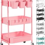- 【Large Capacity】3 individual metal baskets are big enough for a variety of items storage. What’s more,hanging cups and hooks on this rolling utility cart create extra space for small items.